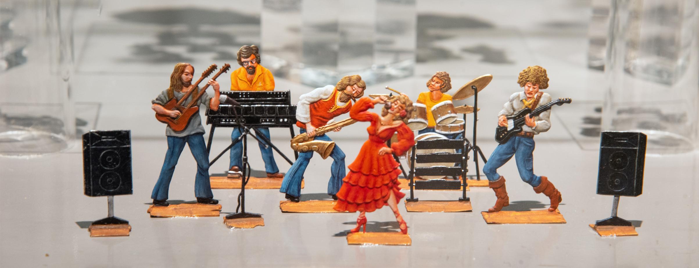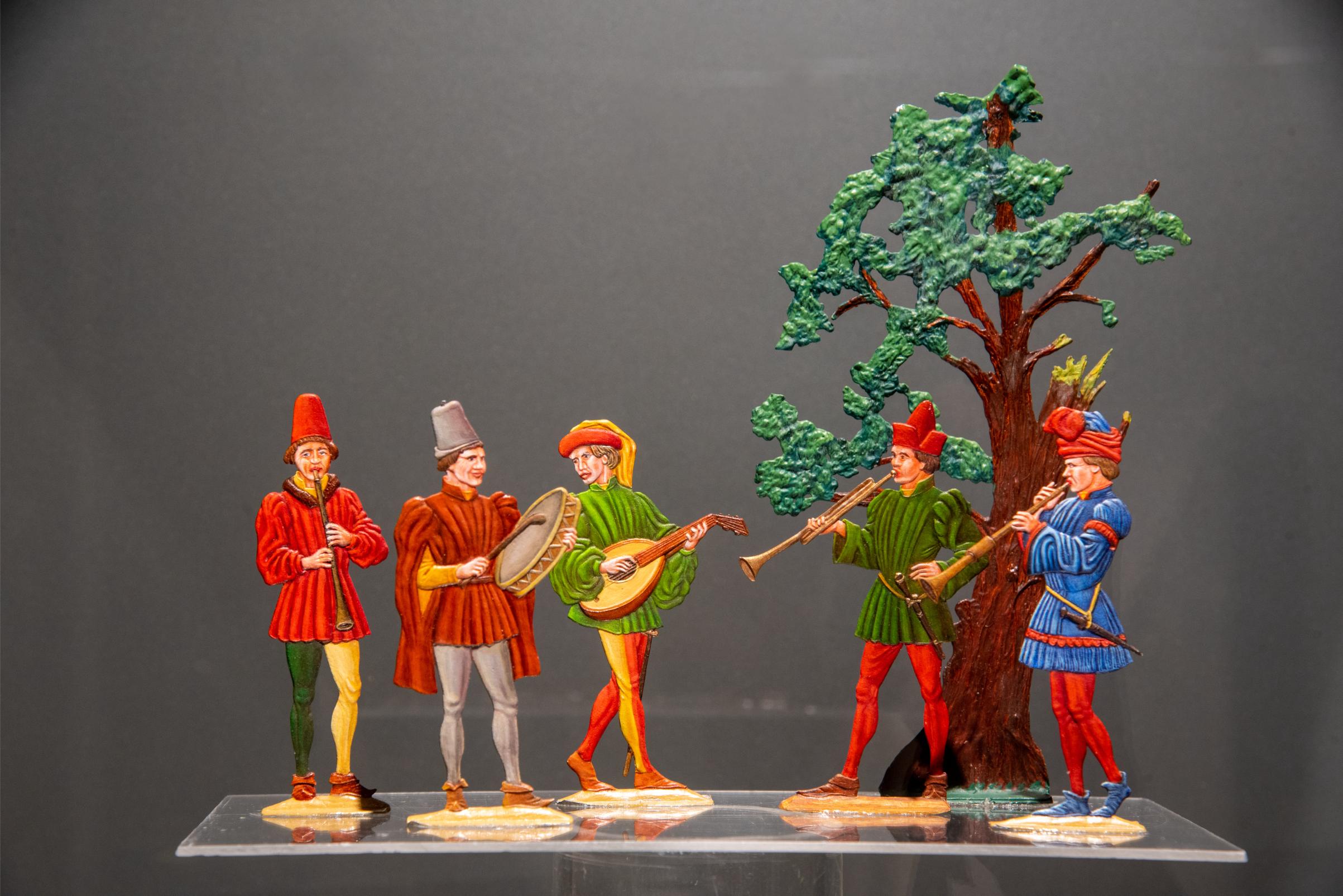 In een serie vitrines exposeren wij tinnen figuren, die muziek maken. De tinnen muzikanten van het museum met hun ensembles en omringd door toeschouwers, luisteraars, dansers en marcherende soldaten, tonen ons hoe vroeger in verschillende culturen muziek werd gemaakt.